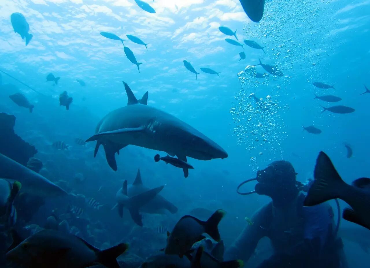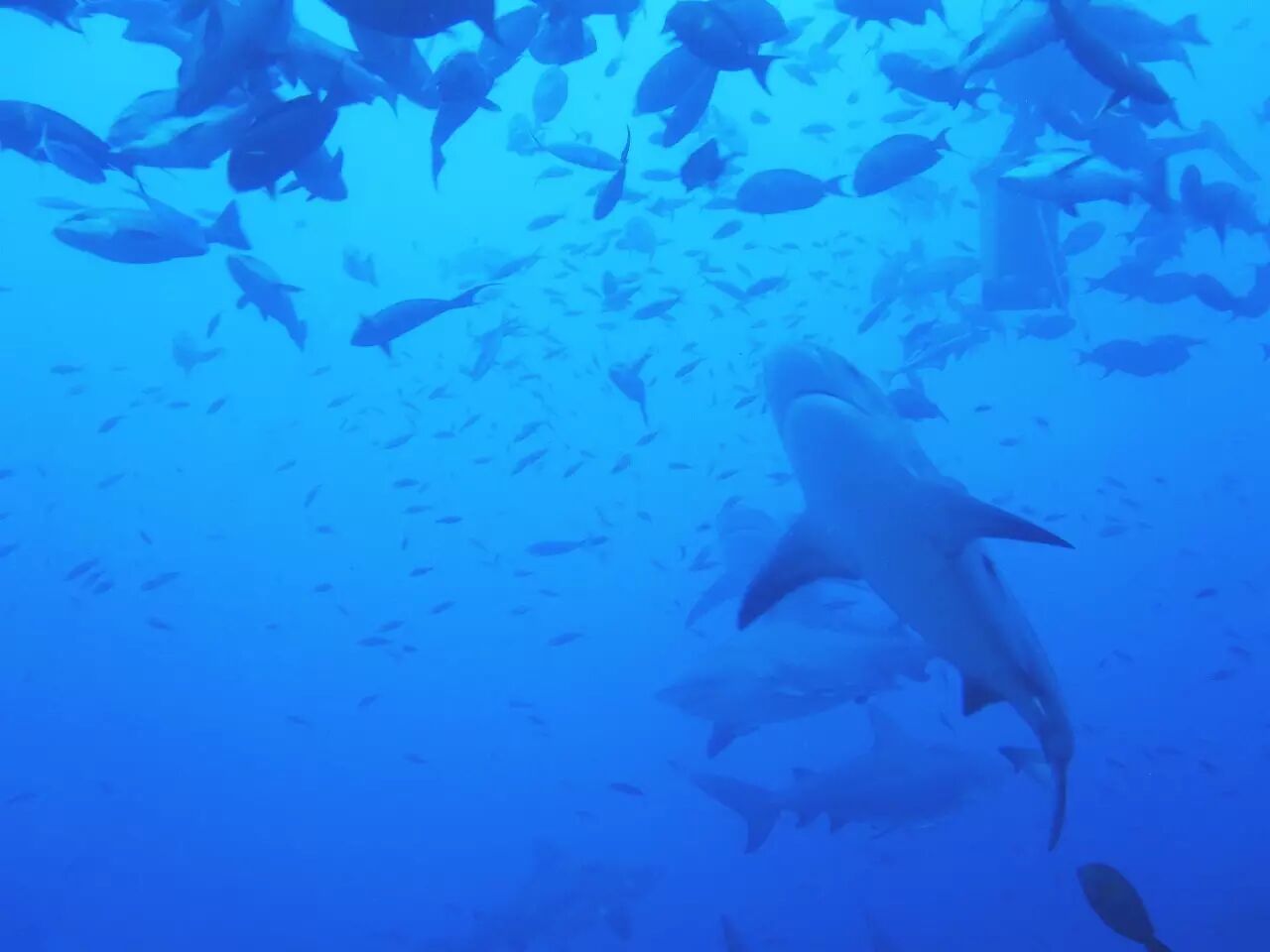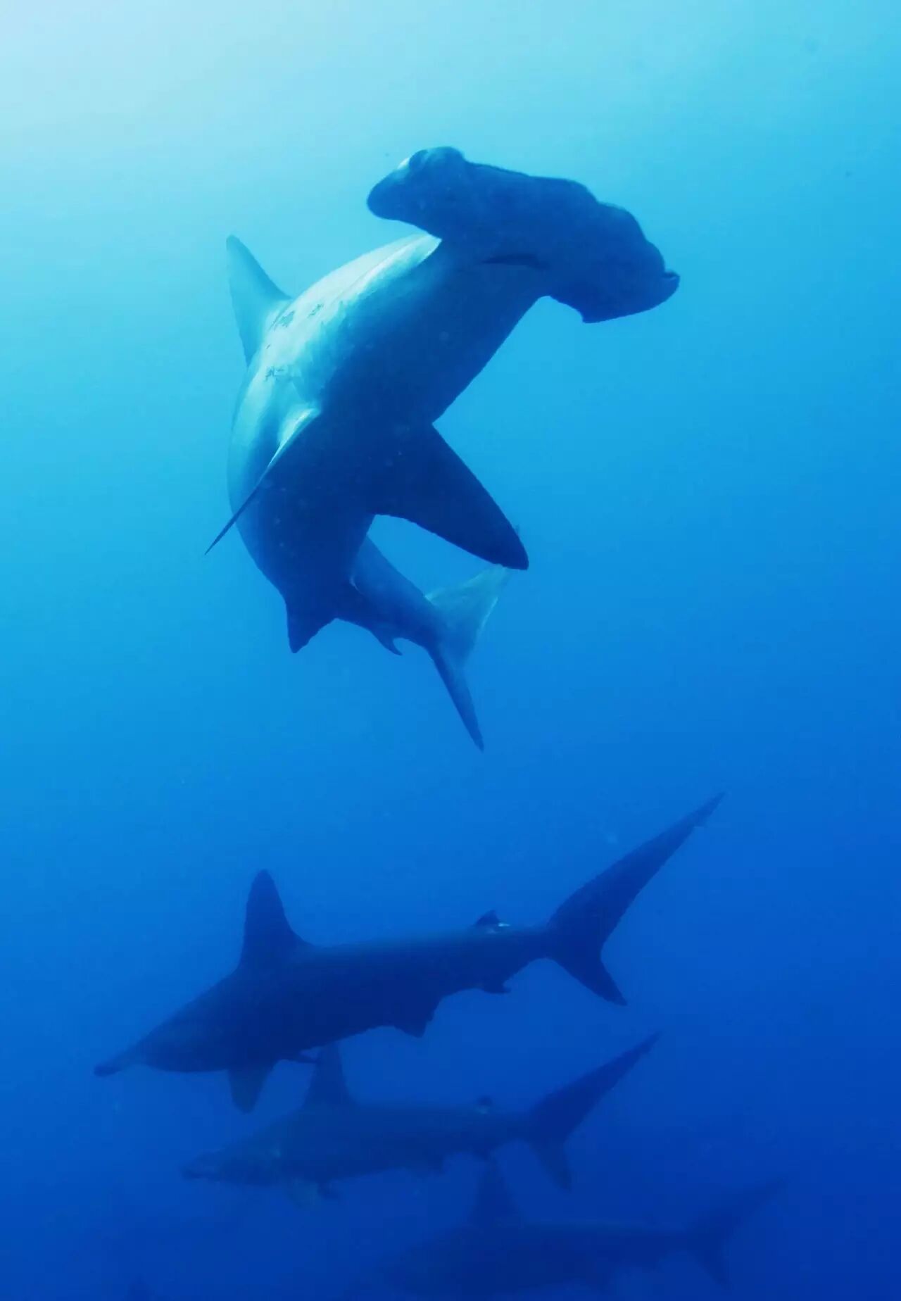算算我们一共看见了多少条,几百条是起码的了,近千条都有可能。当它们聚在一起时,显然就胆子大了不少,有几条是贴着镜头游过去的。看着看着,我们突然听到一个尖厉的声音,这些锤头鲨立刻“嗖”的一下,集体消失不见。潜导说,这有可能是它们听到了虎鲨的叫声。