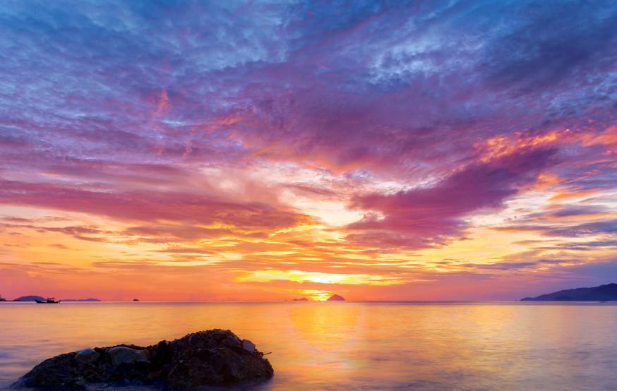 每天黎明时分,海滩的景色渐渐就会随着太阳的升起而渐觉明朗,沙岸旁那挺拔高耸的椰树开始眺望大海远方的冉冉升起的太阳,沙滩色调变得流金溢彩。