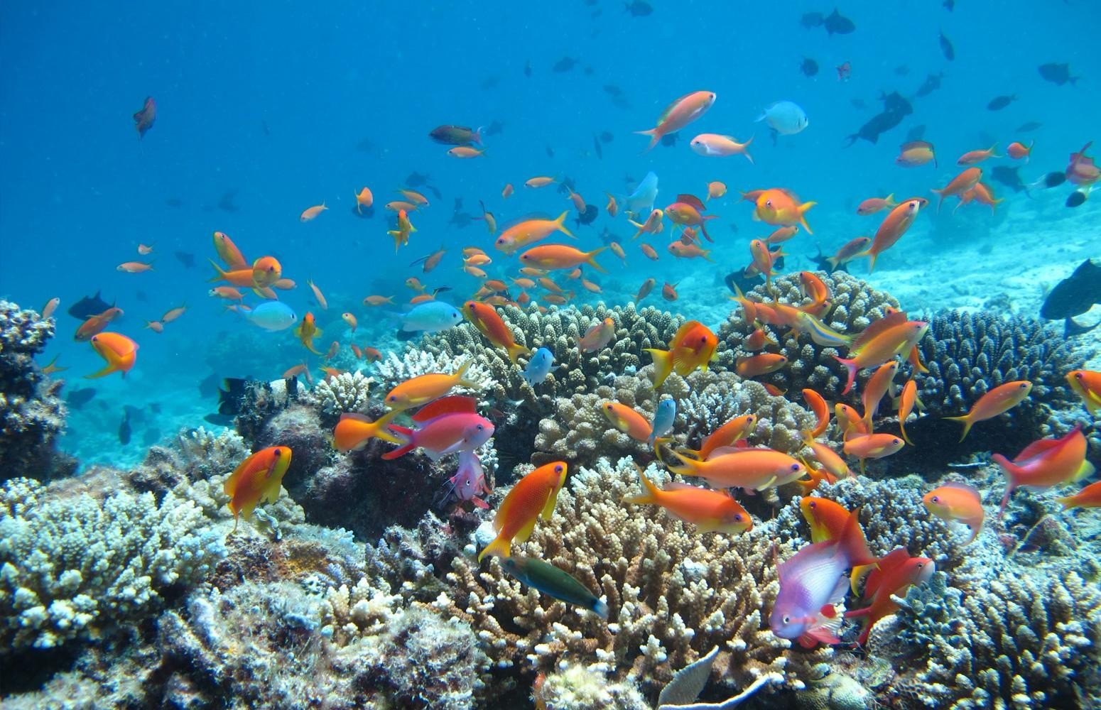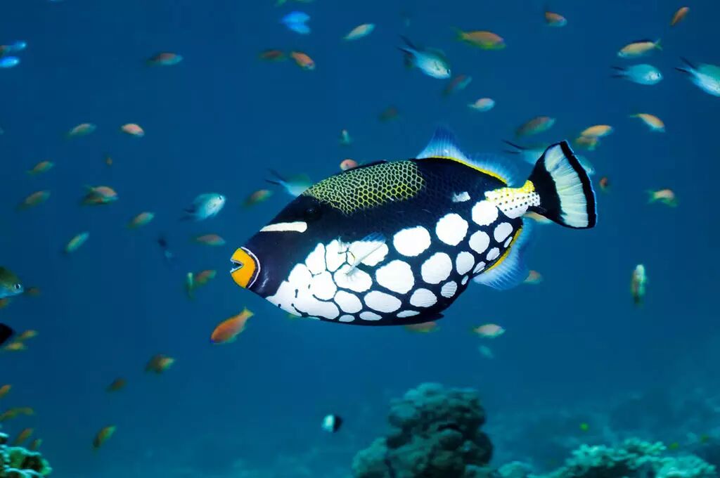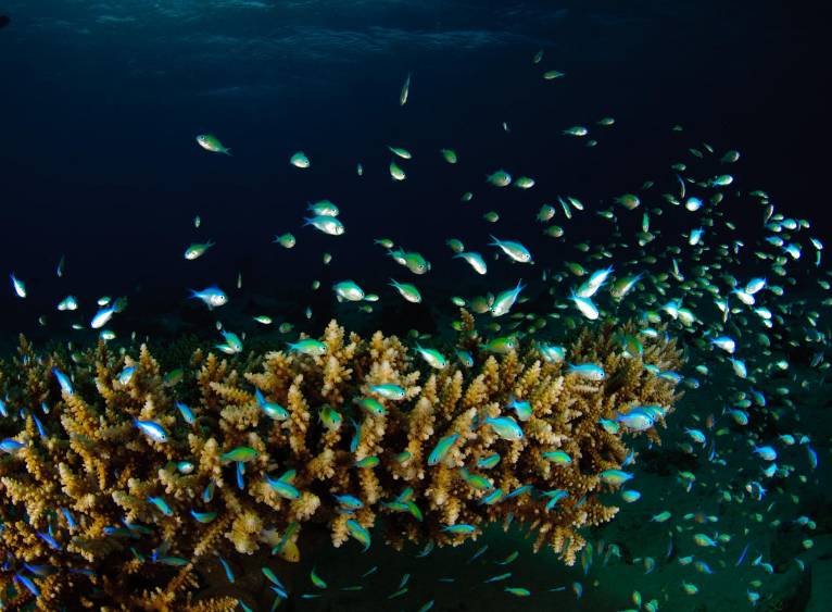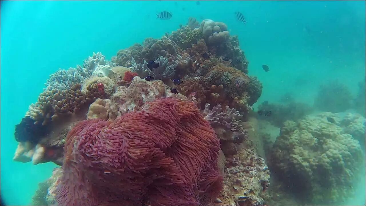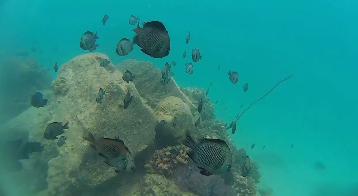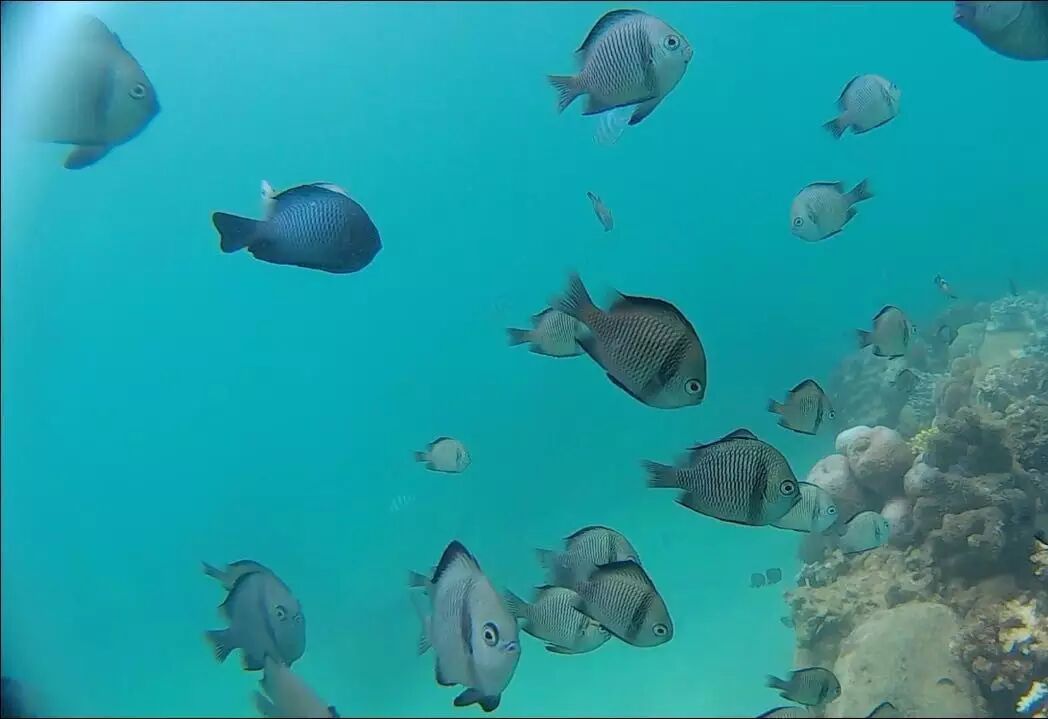 珊瑚鱼类很丰富,比如:蝴蝶鱼,青衣,天使鱼等, 也有大的鱼,如:groups, jacks.