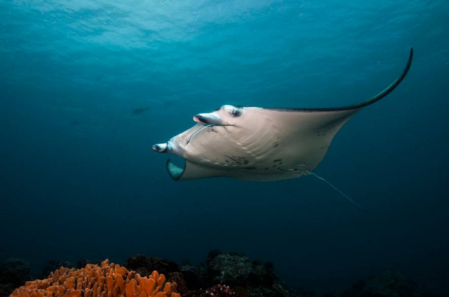 垂直下降35米的岩壁长着各色珊瑚。
