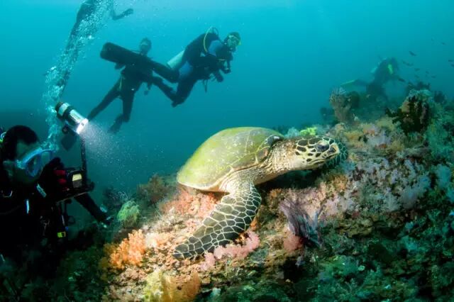 一个叫”天堂俱乐部”的地方,真可以说是绿瓗龟的圣殿,同时也是大目鰺及乌贼的家。有时,如果你够幸运的话,你还可以看到儒艮。而在40分钟路程的外海,你可以到达是棒的沉船潜点,清澈的海水加上数不清的鱼,絶对会让你有个难忘的沈船潜水经验。